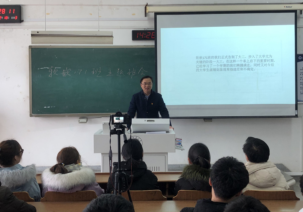 12月18日下午,软嵌171班“凝心聚力、迎势启航”主题班会在文通楼211教室圆满举行。本次班会由副董事长严云洋教授发起,班主任樊宁老师主持。辅导员唐康老师和全班员工参加了班会。